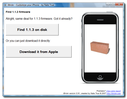 iBrickr will download the necessary files. You will then be presented with the option to find the 1.1.3 firmware on your disk or to download it from Apple. Click the Download it from Apple button.