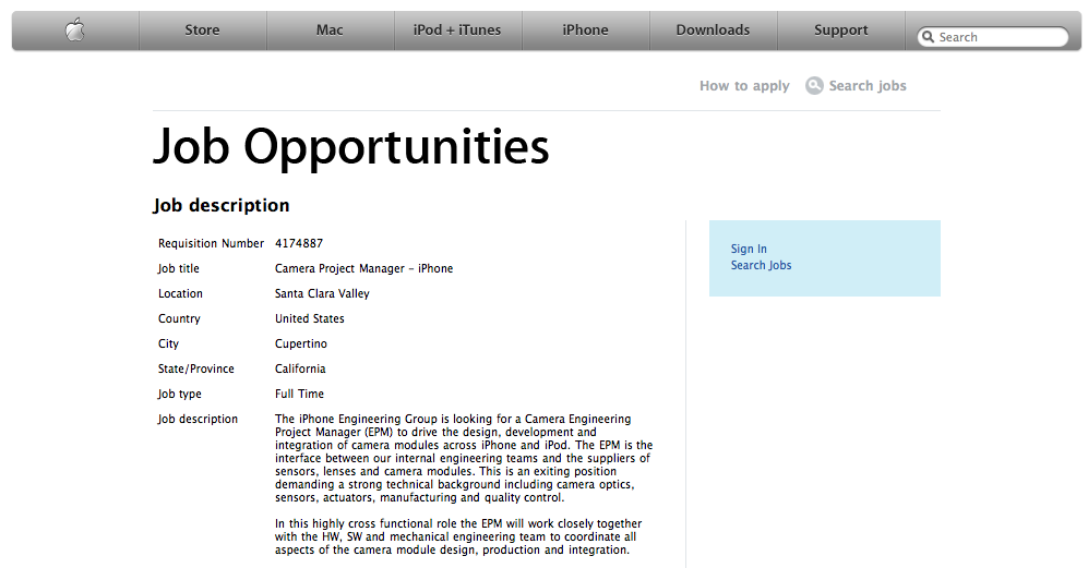 The job listing is for a Camera Engineering Project Manager who would be responsible for the "integration of camera modules across iPhone and iPod". You can read more of the listing below.