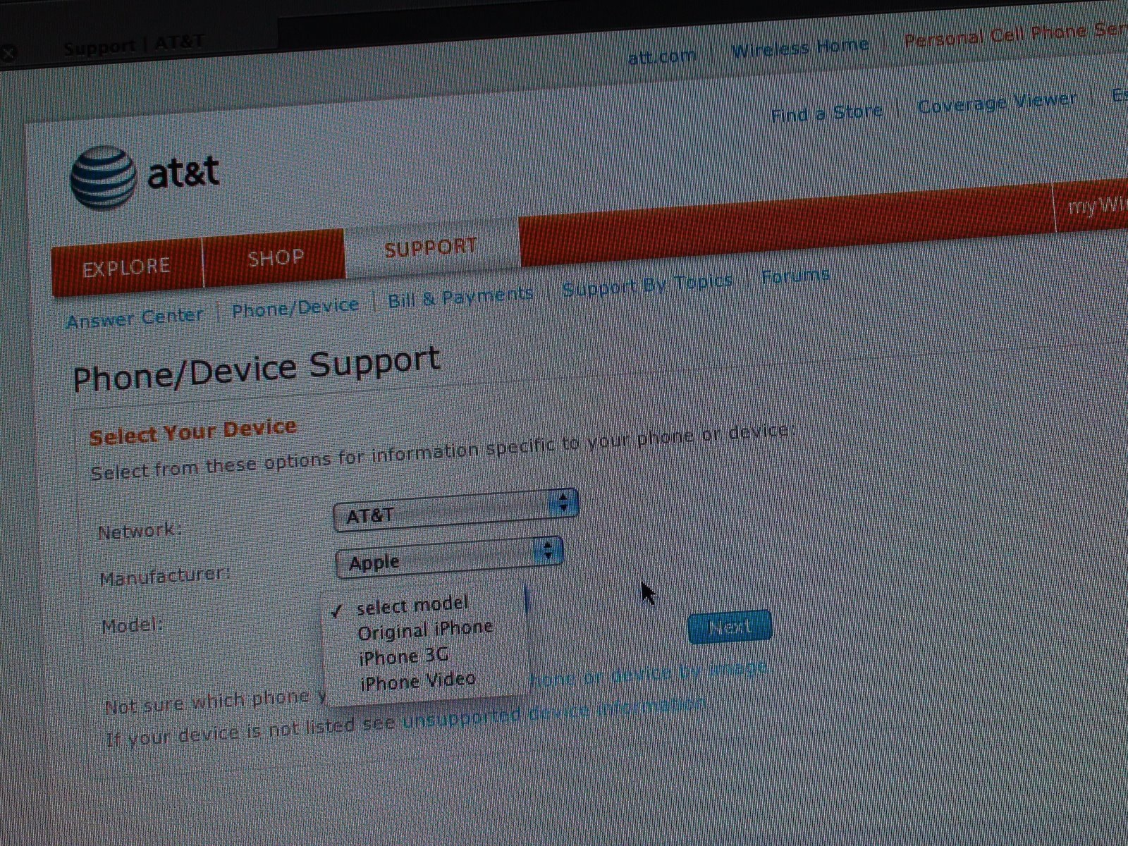 Currently only Original iPhone and iPhone 3G are listed as choices; however, this screenshot could be from a unpublished website that will go live once AT&T begins selling the device.