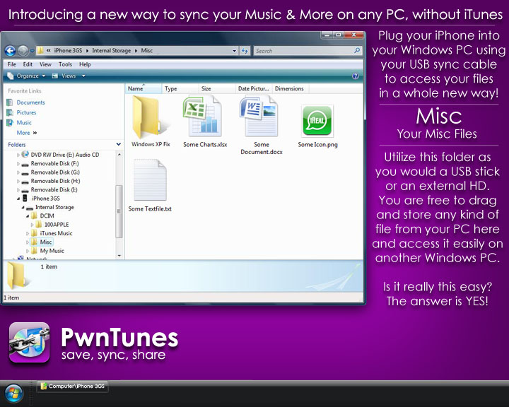 With PwnTunes It’s as easy as plugging your sync cable into your Windows PC.