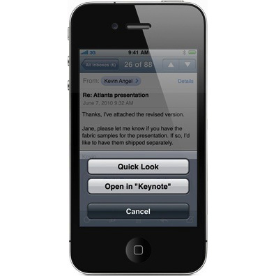 According to MacRumors, Apple's iPhone 4 Features Page briefly showed a screenshot with a dialog box asking if the user would like to open a mail attachment in Keynote.
