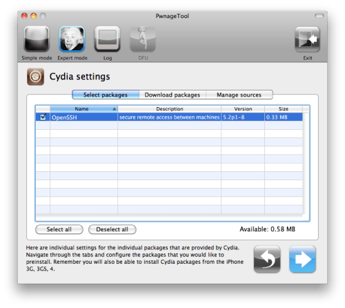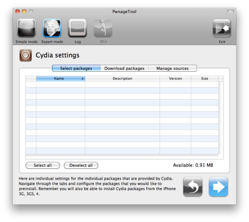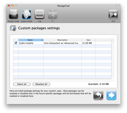 The Custom Packages Settings menu displays listed package settings for your custom IPSW. For know leave these settings as is. Click the blue arrow button to continue.