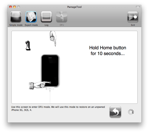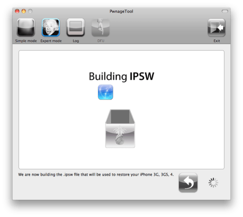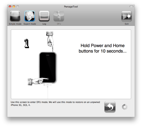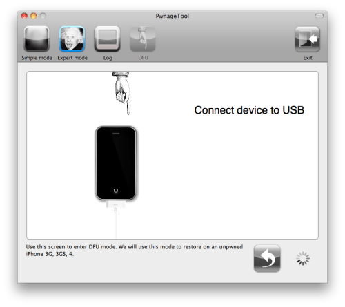 Once your ipsw has been built you will be asked to connect your iPhone to the computer. Once it detects your device PwnageTool will guide your through the steps to putting your iPhone into DFU mode.