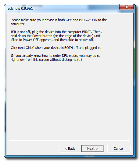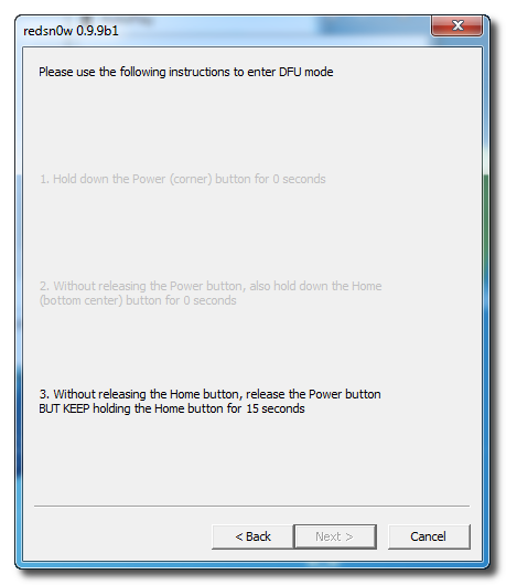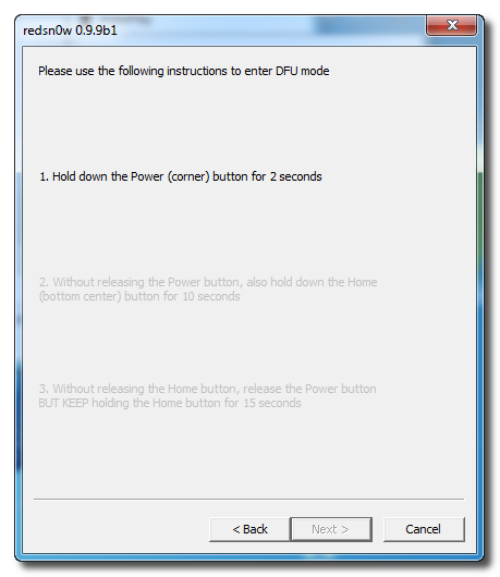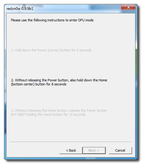 RedSn0w will now guide you through the steps to get into DFU mode.