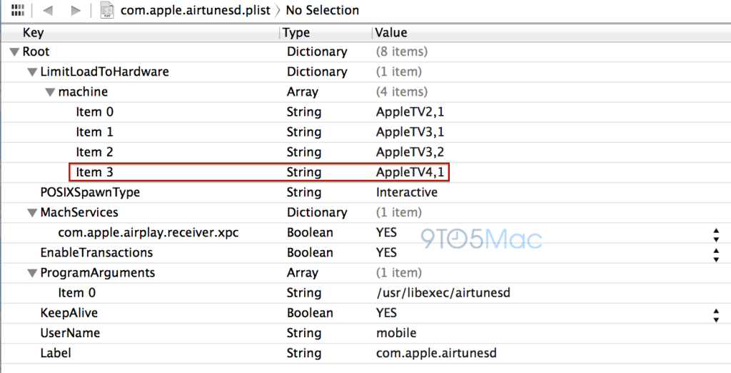 The reference is inside of an Apple TV framework related to the device’s AirPlay functionality. The mention of the next Apple TV is the highlighted “AppleTV4,1.” The current Apple TV is “AppleTV3,2″ while “3,1″ is the 1080P model introduced in March 2012, and 2,1 is the first iOS model introduced in September 2010.