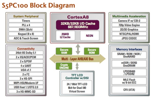 The chipset has been identified as the SoC S5PC100 from Samsung meaning an ARM Cortex A8 which runs at 600 MHz (can operate at up to 833MHz). Also discovered was the PowerVR SGX for graphics and 256MB of RAM.