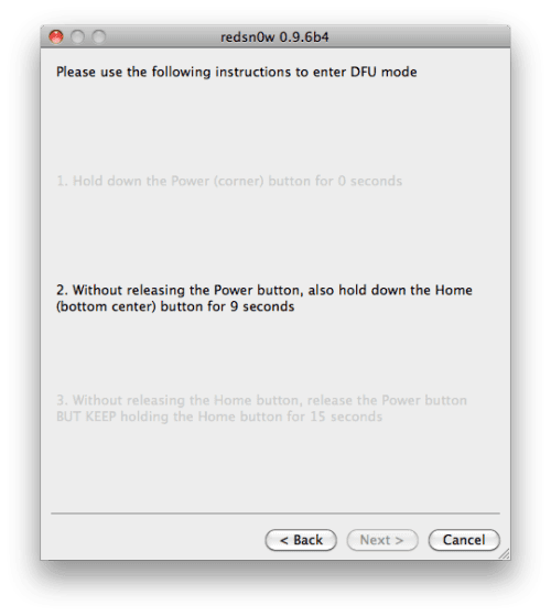 RedSn0w will now guide you through the steps to get into DFU mode.